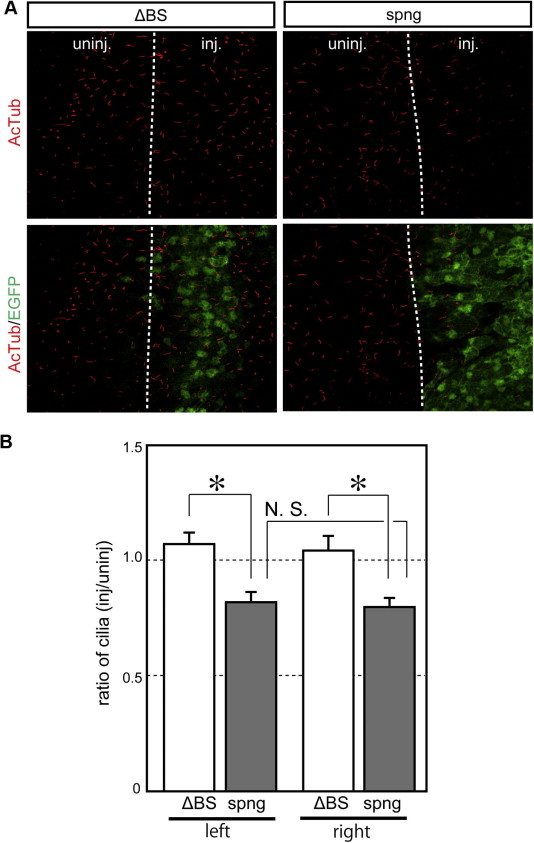 Abundance of GRP cilia is reduced by IP3 sponge RNA. (A) Representative images of gastrocoel roof plate (GRP) cilia in δBS or IP3 sponge (spng) RNA-injected Xenopus embryos. Injection side was determined by fluorescence from co-expressed enhanced green fluorescent protein (EGFP). Cilia in the GRP adjacent to the blastopore were counted. Green, EGFP; red, acetylated tubulin (AcTub); dotted line, midline; top, anterior: left side of image is left side of embryo. (B) Quantification of GRP cilia. The number of cilia on the injected side was expressed as a ratio of the number on the uninjected (opposite) side (i.e., number of red signals in inj./that in uninj. in A). Normal embryos showed symmetric distribution of GRP cilia [18], and δBS RNA-injected embryos showed nearly symmetrical distribution. IP3 sponge RNA-injected embryos had fewer cilia on the injected side. n = 18â25 for each group. âP < 0.0001 by MannâWhitney U-test.