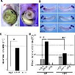 IP3 receptor function-blocking antibody injection. (A) Ventral view of Xenopus tadpole injected with mouse IgG or 1G9 into dorsal left or right blastomeres at the four-cell stage. Head is at top of photograph. Tadpole injected with control mouse IgG (mIgG) shows clockwise heart looping (red arrow) and anticlockwise gut looping (black arrow). 1G9-injected embryo (αIP3R) had reversed heart and/or gut looping. (B) Lateral view of Pitx2 whole-mount in situ hybridization of tail bud-stage embryo. Pitx2 expression was detected in the head and leftlateral plate mesoderm (LPM) (arrowhead). Uninjected (uninj) and control IgG (mIgG) injected mouse embryos showed normal expression patterns. In contrast, 1G9-injected embryos often showed normal expression in the head but bilateral expression (white arrow) or no expression pattern (data not shown) in the LPM. (C) Percentages of reversed organs in 1G9-injected embryos. Control embryos (mIgG) did not show organ reversal, but 1G9-injected embryos had a significantly increased percentage of reversed organs. n > 70 for each group. P = 0.0011, chi-square test. (D) Percentages of Pitx2 misexpression (see text for definition). Embryos were injected with antibodies (mIgG or αIP3R) on one side or acted as uninjected controls (uninj). Left-sided injection of 1G9 frequently induced misexpression of Pitx2 in the LPM. n > 250 for each group. ââP < 0.005; âââP < 1 à 10â9, chi-square test.