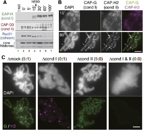 Spatial and temporal regulation of Condensins I and II in mitotic chromosome assembly in human cells.