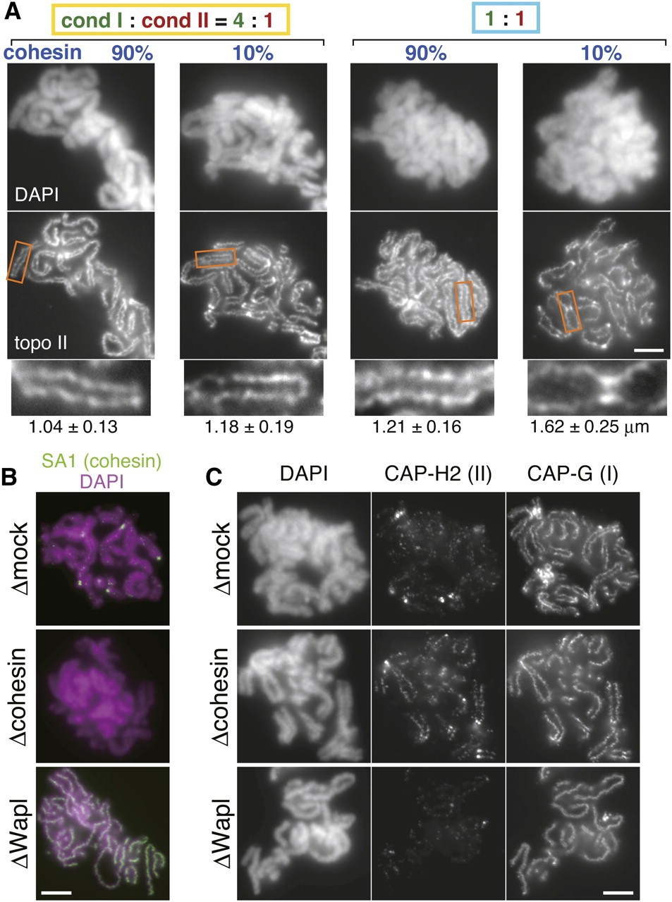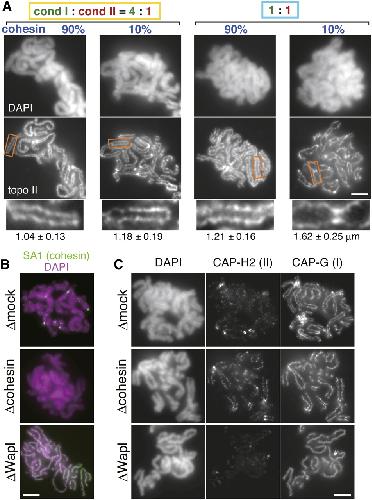 Figure 3. Cohesin collaborates with condensins to shape chromosomes. (A) Chromosomes were assembled in extracts containing various levels of cohesin and condensin I (for details, see Supplemental Fig. S4A), and subjected to immunofluorescence analysis with anti-topoisomerase II (topo II). Blowup images of selected regions (indicated by the rectangles) are shown in the bottom row. Bar, 5 μm. The average distance between sister chromatids, together with standard deviation, is provided below each image (n = 22, 28, 21, 20, from left to right). (B) Chromosomes were assembled in a control extract (δmock), an extract depleted of cohesin (δcohesin), or Wapl (δWapl). To visualize cohesin left on these chromosomes, immunofluorescence was performed with an antibody against its SA1 subunit. Bar, 5 μm. (C) Chromosomes were assembled as described in B, and labeled with anti-CAP-G and anti-CAP-H2 antibodies. Bar, 5 μm.