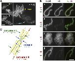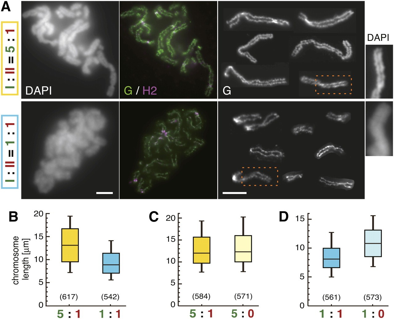Figure 2. The relative ratio of condensin I to II determines the shape of duplicated chromosomes in Xenopus egg extracts. (A) Duplicated chromosomes were assembled in a control extract (I:II = 5:1) or a reconstituted extract (I:II = 1:1) (for details, see Supplemental Fig. S2A,B), and processed for immunofluorescence. The third panels on each row are galleries of CAP-G-labeled images of individualized chromosomes. Magnified DAPI images of the selected regions of chromosomes (indicated by the broken boxes) are shown at the right. Bars, 5 μm. (B) The lengths of chromosomes assembled in A are shown in the box plot. The middle line of each box is the median. The top and bottom lines are the third and first quartiles, and the whiskers indicate the 90th and 10th percentiles. The numbers of chromosomes measured are shown in parentheses (P = 1.2 à 10â51, t-test). (C,D) The lengths of chromosomes assembled in different extracts are compared pairwise in the box plots. A statistically significant difference was seen only between the right pair (P = 0.22, left; P = 2.2 à 10â31, right). The distribution of chromosome lengths in each condition examined in BâD is also shown in histograms (Supplemental Fig. S6).