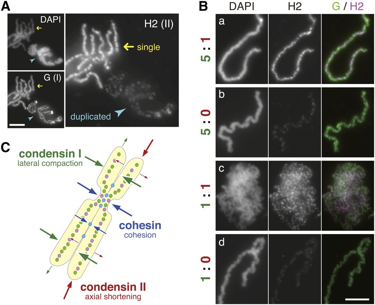 Figure 4. Balancing actions of two condensins are also important for single-chromatid assembly. (A) Single chromatids (yellow arrows) and duplicated chromosomes (blue arrowheads) were assembled separately, fixed on a single slide, and subjected to immunofluorescence. Bar, 5 μm. (B) Sperm chromatin was incubated with metaphase-arrested extracts containing condensin I and II at the indicated ratios. After an 80-min incubation, chromatids were analyzed by immunofluorescence. Bar, 5 μm. (C) A model of how balancing actions of condensins and cohesin determine the shape of chromosomes is depicted in the cartoon.