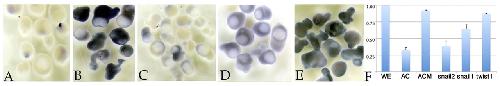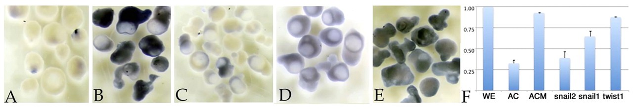Fig. 5. Dorsal mesoderm-animal cap explant studies. (A) When cultured alone, wild-type ectoderm (animal cap) contained little sox9 RNA, as visualized by in situ hybridization (analysis carried out when control embryos had reached stage 17/18). (B) When cultured together with DLMZ from wild-type Xenopus embryos, sox9 RNA accumulated (in the ectodermal region). (C) By contrast, DLMZ from snail2 C2/C3 morphant embryos failed to induce sox9 RNA. (D,E) snail1 morphant DLMZ appears to be intermediate in its ability to induce sox9 expression (D), whereas twist1 morphant DLMZ retained the ability of induce sox9 expression (E). (F) qPCR analysis of sox9 RNA levels supports this general trend. For each condition, 5-15 explants were analyzed when unmanipulated embryos had reached stage 17/18. ODC RNA was used as a standard. WE, whole embryo at stage 17/18 (level set to 1); AC, animal cap/ectodermal explant; ACM, animal cap plus DLMZ from uninjected control embryo; snail2, wild-type animal cap plus snail2 morphant DLMZ; snail1, wild-type animal cap plus snail1 morphant DLMZ; twist1, wild-type animal cap plus twist1 morphant DLMZ. The results shown are representative of more than three replications. Error bars indicate s.d. |