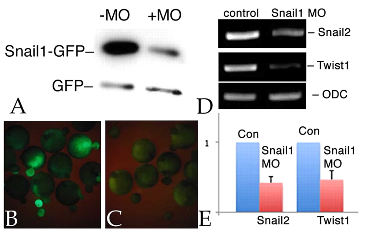 Fig. 1. snail1 MO effects. Xenopus embryos were injected with RNAs encoding myc-tagged GFP (mt-GFP; 50 pg/embryo) and UTR-Snail1-GFP (which latter includes the target of the snail1 MO) RNAs (600 pg/embryo), either alone or together with the snail1 MO (7 ng/embryo). (A) Immunoblot analysis of stage 11 embryos using an anti-GFP antibody revealed a clear and specific reduction in the accumulation of Snail1-GFP as compared with GFP in the snail1 MO-injected sample. (B,C) UTR-Snail1-GFP RNA was injected into one cell of 2-cell embryos either alone (B) or together with the snail1 MO (C). At stage 11, the snail1 MO greatly reduced UTR-Snail1-GFP fluorescence. (D,E) RT-PCR (D) and qPCR (E) analyses indicate that the injection of the snail1 MO into both cells of 2-cell embryos led to a specific reduction in the levels of twist1 and snail2 RNAs at stage 11. Ornithine decarboxylase (ODC) RNA was used to control for non-specific effects. Error bars indicate s.d. |