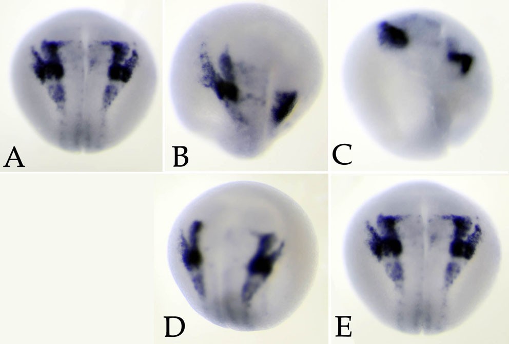 Fig. S4. snail2, snail1 and twist1 morphant phenotype in Xenopus tropicalis. (A-E) The C2 and C3 blastomeres of 32-cell X. tropicalis embryos were injected with snail2 (B,C), snail1 (D) or twist1 (E) MOs (10 ng/embryo). At stage 18, embryos were fixed and stained in situ for sox9 (A, control uninjected embryo); 60% (n=20) of the snail2 morphant embryos showed a decrease in sox9 expression, whereas only 12% (n=25) of the snail1 and 11% (n=35) of the twist1 morphant embryos displayed a similar decrease in sox9 expression. |