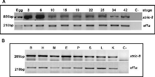 Fig. 2. Temporal analysis of RIC-8 expression pattern in Xenopus development and adult tissue. The expression levels of XtRIC-8 were determined by RT-PCR during different developmental stages of X. tropicalis embryos. Two micrograms of total RNA from each embryonic stage as well as from different adult tissues were reverse-transcribed and amplified using specific primers. Amplification of the ef1α gene, and reactions performed in the absence of reverse transcriptase (C-) were used as housekeeping and negative controls, respectively. (A) The size of each PCR product corresponded to the theoretically predicted sizes of 856 and 218 bp, for xtric-8 and ef1α, respectively. Stages are indicated at the top of each lane. (B) The size of each PCR product corresponded to the theoretically predicted sizes of 289 and 218 bp, for xtric-8 and ef1α, respectively. The tissues are abbreviated as B (brain), H (heart), M (muscle), E (eye), P (pancreas), S (skin), L (lung) and K (kidney).