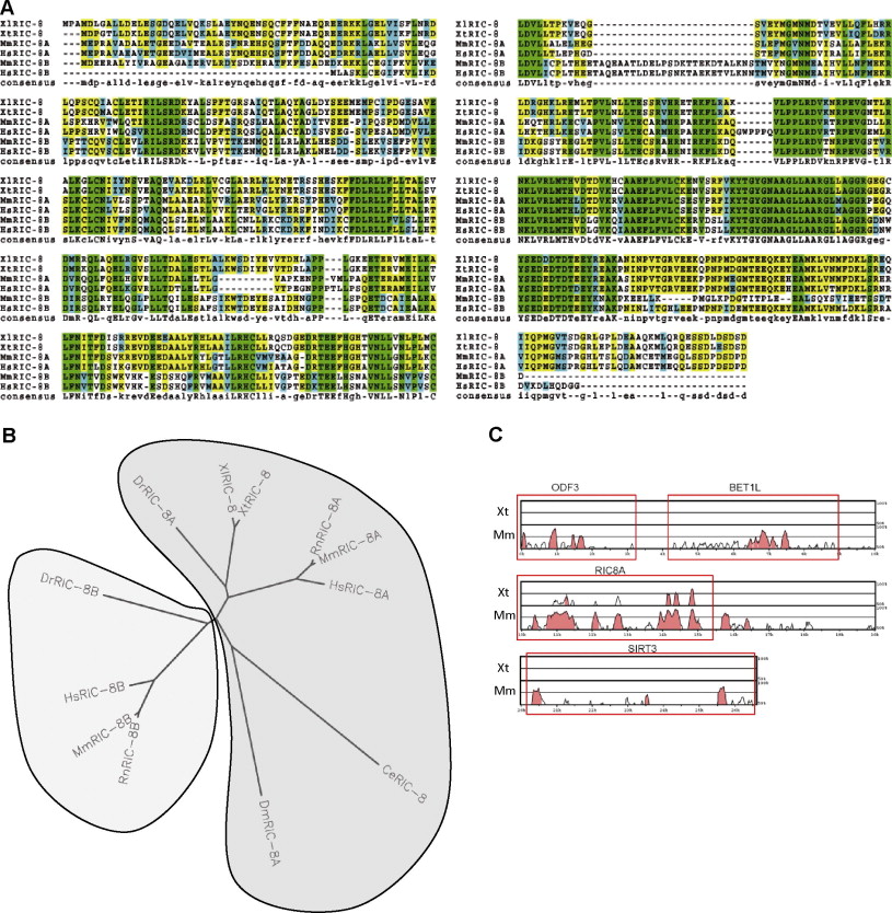 Fig. 1. RIC-8 sequence alignment. (A) ClustalW alignment of RIC-8 amino acid sequence from X. tropicalis and X. laevis with RIC-8A and RIC-8B from Homo sapiens and Mus musculus. Conserved amino acids are highlighted in green, identical amino acids in yellow and homolog amino acids in magenta. (B) Phylogenetic tree of RIC-8 protein sequences from (Xt): Xenopus tropicalis (NP_989159.1), (Xl): Xenopus laevis (NP_001165673.1), (Dr): Danio rerio (A: NP_001005588.1, B: NP_001005293.1), (Mm): Mus musculus (A: NP_444424.1, B: NP_001013459.1), (Rn): Rattus norvegus (A: NP_001093990.1, B: NP_783188.1), (Hs): Homo sapiens (A: NP_068751.4, B: AAH34220.1), (Dm): Drosophila melanogaster (NP_572550.2) and (Ce): Caenorhabditis elegans (NP_001023561.1). The analysis shows that XtRIC-8 is closer related to the vertebrate paralog RIC-8A. (C) Syntenic relationship between X. tropicalis Scaffold 587 and Mus musculus chromosome 7 in comparison with Homo sapiens chromosome 11. The analysis was performed with the VISTA program by comparing the chromosomal regions located between the nearest conserved upstream and downstream genes with respect to the RIC-8 coding region. The nearest genes are shown in red squares. Note that synteny is maintained only in the open reading frame (ORF) of RIC-8.