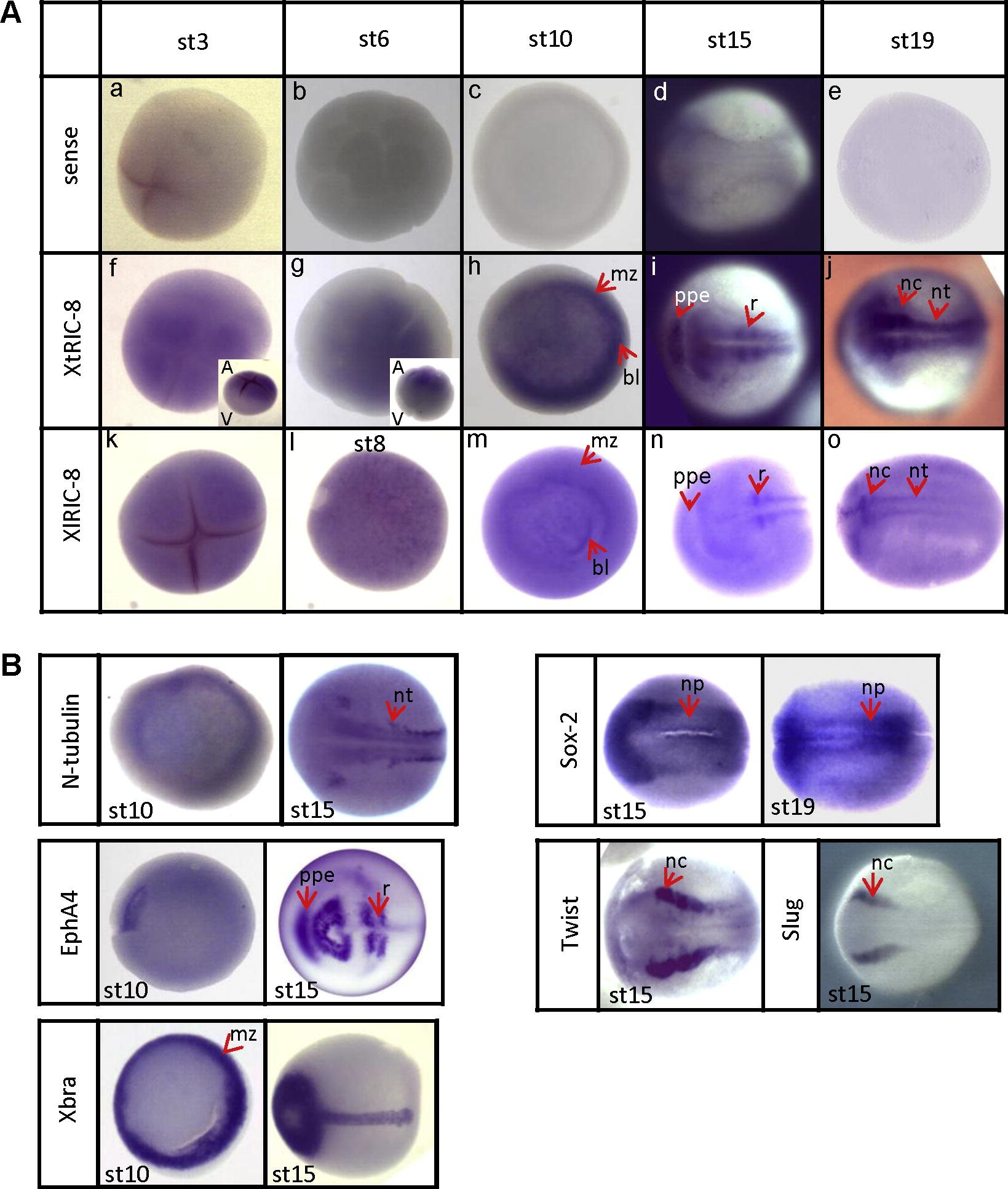 Fig.3. Comparative analysis of XtRIC-8 and control markers by whole mount in situ hybridization at early developmental stages of Xenopus tropicalis embryos. (A) The tissue specific expression pattern of ric-8 at different early stages of X. laevis and X. tropicalis embryonic development was analyzed by whole mount in situ hybridization. Probes are indicated in each panel at the left, stages are indicated at the top of each panel. XtRIC-8 antisense probe is shown on panels fâj, whereas XlRIC-8 probe is shown on panels from k to o. XtRIC-8 sense probe was used as negative control (panels aâe). Animal views are shown for embryos at stage 3, 6 and 8; vegetal views for embryos at stage 10 and dorsal views for embryos at stage 15 and 19. AnimalâVegetal (AâV) lateral view is shown in the inset at stages 3 and 6 (panels f and g). (B) The tissue specific expression of different control markers was determined at different developmental stages of X. tropicalis embryos by whole mount in situ hybridization. Sox-2, N-tubulin, EphA4, Twist, Slug and Xbra were used as control markers. Probes are indicated at the left side of each row and stages at the bottom-left side of each panel. Vegetal views are shown for stage 10; dorsal views for stage 15 and 19. Red arrows indicate specific structures that were labeled as: r (rhombomeres), nt (neural tube), nc (neural crest), mz (marginal zone), bl (blastopore lip), ppe (pre-placodal ectoderm) and np (neural plate).