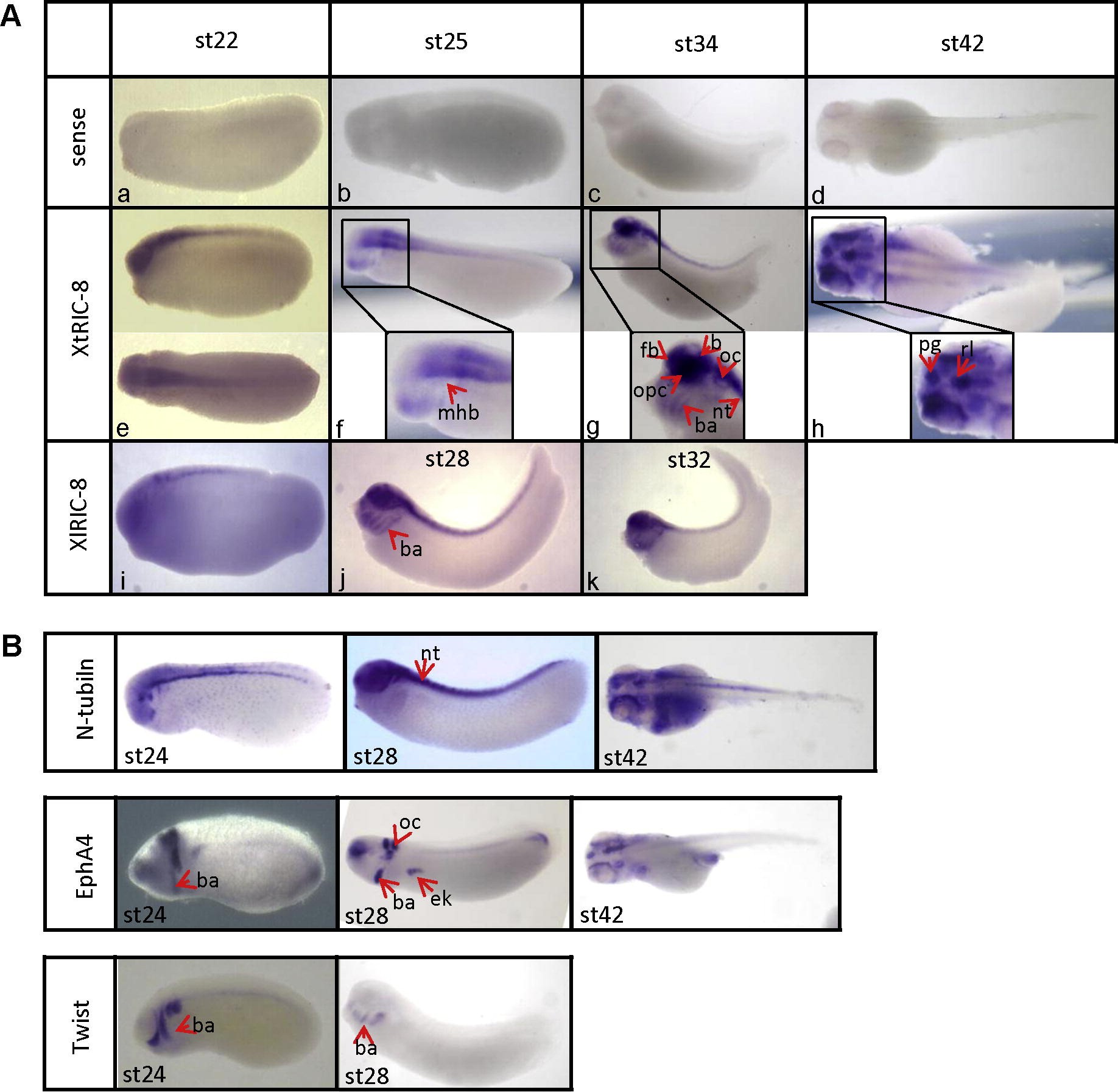 Fig.4. Comparative analysis of XtRIC-8 and control markers by whole mount in situ hybridization at later developmental stages of Xenopus tropicalis embryos. (A) The tissue specific expression pattern of ric-8 at different later stages of X. laevis and X. tropicalis embryonic development was analyzed by whole mount in situ hybridization. Probes are indicated in each panel at the left and stages are indicated at the top of each panel. XtRIC-8 (panels eâh) and XlRIC-8 (panels iâk) antisense probe reactions are shown. XtRIC-8 sense probe was used as negative control (panels aâd). Lateral views are shown for embryos at stage 22, 25, 28, 32 and 34, and dorsal views are shown for embryos at stage 22 and 42. For embryos at stages 25, 34 and 42 that were hybridized with the antisense XtRIC-8 probe, a higher magnification view from the head is also shown in the inset (panels f, g and h). (B) The tissue specific expression of different control markers were determined at different developmental stages of X. tropicalis embryos by whole mount in situ hybridization. N-tubulin, EphA4 and Twist were used as control markers. Probes are indicated at the left side of each row and stages at the bottom-left side of each panel. Lateral views for stages 24, 28 and dorsal views for stage 42. Red arrows indicate specific structures that were labeled as: nt (neural tube), mhb (mid/hindbrain), b (brain), fb (forebrain), opc (optic cup), oc (otic capsule), ba (branchial arches), pg (pineal gland), rl (rhombic lip) and ek (embryonic kidney).