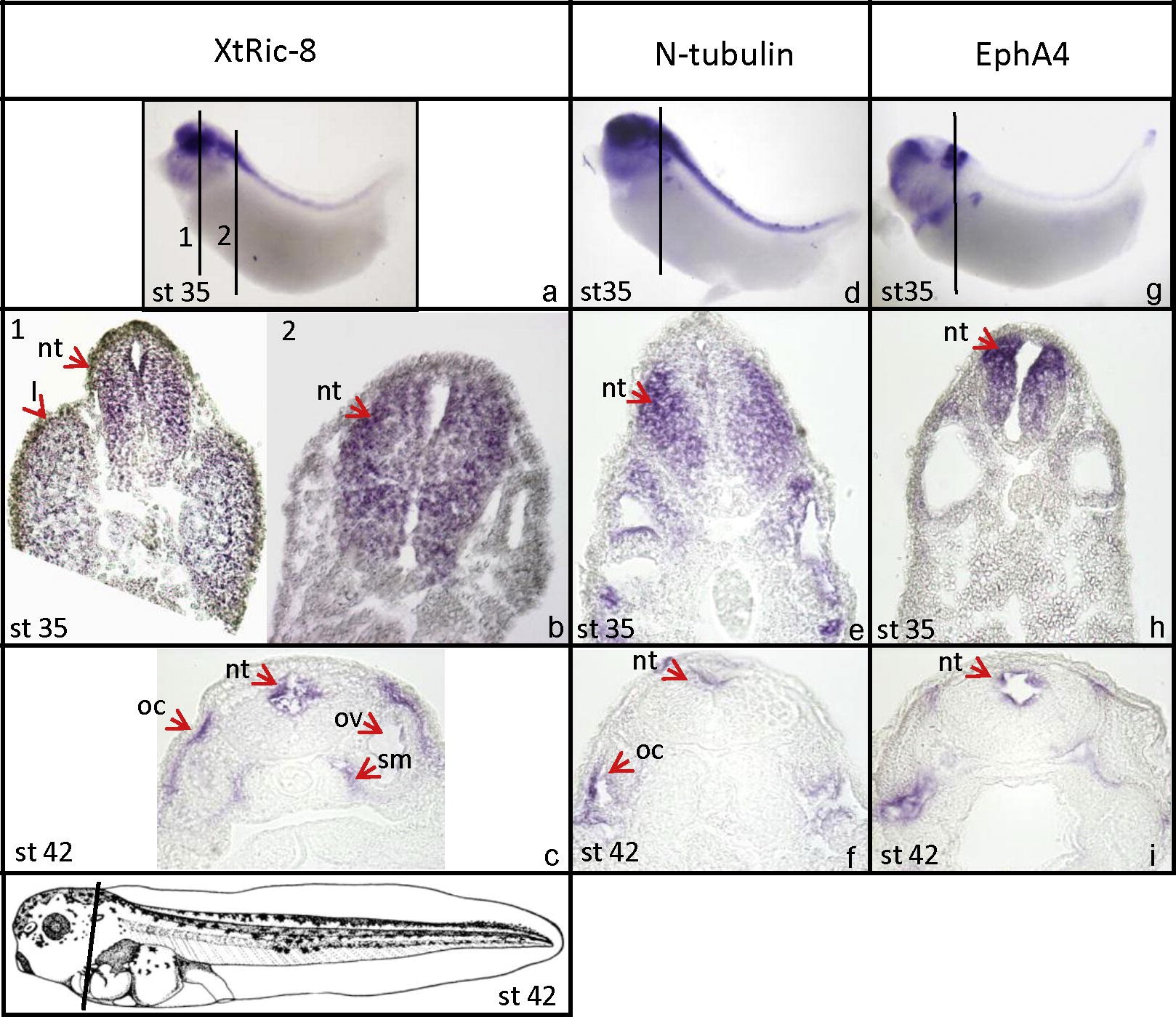 Fig.5. Comparative cross-section in situ hybridization analysis of XtRIC-8, N-tubulin and EphA4 in two developmental stages of X. tropicalis embryos. The tissue specific expression of XtRIC-8, the neuronal marker N-tubulin and the neural crest marker EphA4, were determined at stage 35 and 42 of X. tropicalis embryos by whole mount in situ hybridization. Embryos were coronally sectioned every 16â20 μm. The black lines in the upper panels indicate the position of the visualized sections. The probes are indicated at the top of the figure and the embryo stage at the bottom-left of each panel. Lateral views are shown for stage 35 embryos. The bottom panel shows a representation of the cross section of a stage 42 embryo. Red arrows indicate specific structures that were labeled as: nt (neural tube), l (lens), oc (otic capsule), ov (otic vesicle), and sm (somites).