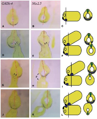 Fig. 4 The expression domains of GATA-4, Nkx2.5, and Hand1 are