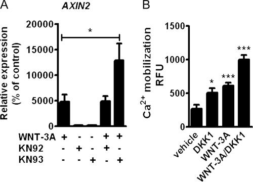 Figure 5. Wnt canonical and Wnt-CaMKII noncanonical pathways are reciprocally inhibitory in AHACs. (A) Q-PCR for AXIN2 of primary AHACs treated with 100 ng/ml WNT-3A in the presence of the CaMKII inhibitor KN93 or its inactive analogue KN92 (10 µM). (B) DKK1 promoted intracellular calcium accumulation in P0 AHACs. The inhibition of the canonical pathway with DKK1 enhanced intracellular calcium accumulation induced by WNT-3A. In all the experiments, n = 4. Data in A were analyzed with ANOVA; data in B were analyzed with an unpaired t test. Error bars indicate mean ± SEM. *, P < 0.05; ***, P < 0.0005. |
