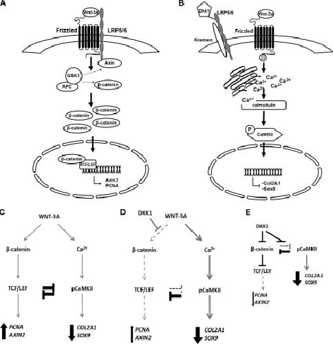 Figure 7. Simultaneous activation and reciprocal inhibition of β-cateninâ and CaMKIIâdependent pathways in AHACs. (A and B) In AHACs, WNT-3A up-regulates AXIN2 expression and proliferation through the Wnt canonical pathway (A), but induces loss of differentiation via a G proteinâmediated Ca2+/CaMKIIâdependent pathway (B). (CâE) These two pathways are reciprocally inhibitory and in equilibrium. Therefore, either exogenous WNT-3A (C) or blockade of the canonical pathway with DKK1 (DâE) will both result in loss of chondrocyte phenotype. |