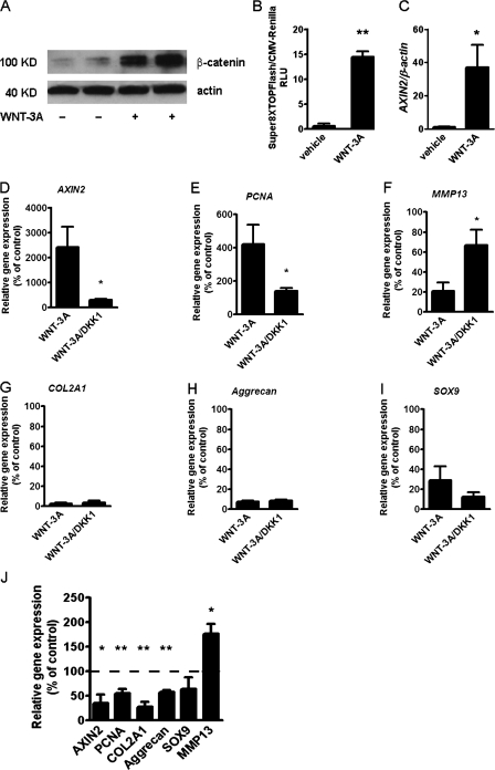 Figure 3. Inhibition of Wnt canonical pathway with DKK1 does not rescue the loss of the chondrocyte phenotype. (AâC) WNT-3A activates the Wnt canonical pathway in AHACs. (A) Western blotting for β-catenin in the cytoplasmic fraction of AHACs treated with 100 ng/ml WNT-3A or vehicle control for 24 h. (B) WNT-3A activated the SUPER8TOPFlash reporter assay in P0 AHACs after 24 h of stimulation (n = 3). (C) WNT-3A up-regulated the expression of the endogenous Wnt canonical target gene AXIN2 in AHACs as evaluated by Q-PCR. Values were normalized for the housekeeping gene β-actin. (DâI) Primary AHACs were treated for 24 h with 100 ng/ml of recombinant WNT-3A or DKK1, alone or in combination, and were subjected to gene expression analysis by PCR. Blockade of the Wnt canonical pathway by DKK1 rescued the modulation of AXIN2, PCNA, and MMP13 mRNA (DâF) but not the down-regulation of COL2A1, Aggrecan, and SOX9 (GâI). (J) In the absence of exogenous WNT-3A, treatment with 100 ng/ml DKK1 resulted, as expected, in down-regulation of the mRNA levels of AXIN2 and PCNA, but also in a paradoxical down-regulation of COL2A1 and Aggrecan similar to that induced by WNT-3A. Q-PCR data, n = 6. Gene expression values are reported as a percentage of up- or down-regulation compared with control (100% is indicated by the broken line in the graph). Data were analyzed with an unpaired t test. Error bars indicate mean ± SEM. *, P < 0.05; **, P < 0.005. |