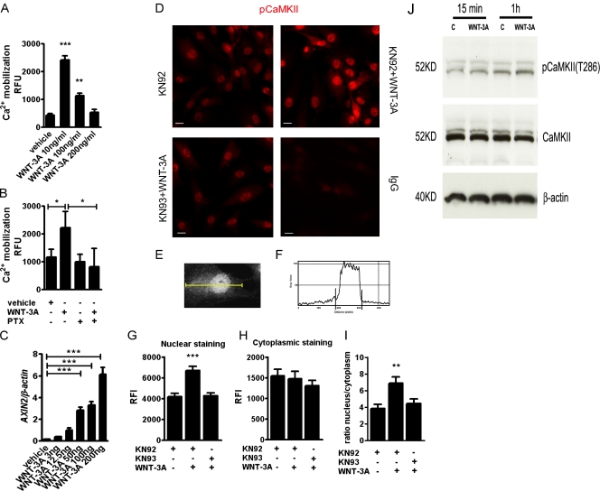 Figure 4. WNT-3A promotes intracellular Ca2+-mediated phosphorylation of CaMKII and its nuclear translocation. (A) WNT-3A caused calcium mobilization in AHACs, particularly at low doses. Primary AHACs were treated with different amounts of recombinant WNT-3A or vehicle control for 5 min and then subjected to fluorometric determination of calcium mobilization (n = 9). (B) WNT3A-induced calcium mobilization assay in primary AHACs is G protein dependent. AHACs were preincubated overnight at 37°C with 1 µg/ml of the G protein inhibitor PTX and then treated for 5 min with 100 ng/ml of WNT-3A or vehicle control. PTX treatment blocked calcium mobilization induced by WNT-3A (n = 6). (C) Q-PCR for AXIN2 mRNA in primary chondrocytes exposed for 24 h to different doses of recombinant WNT-3A. WNT-3A induced dose-dependent up-regulation of AXIN2 in primary AHACs (n = 3). (D) WNT-3A induced nuclear accumulation of the phosphorylated form of CaMKII. Immunofluorescence staining for pCaMKII in P0 AHACs stimulated for 24 h with WNT-3A in combination with either the CaMKII inhibitor KN93 or its inactive analogue KN92 (both 10 µM). Bar, 20 µm. (EâI). Quantification of the pCaMKII fluorescence intensity in the nuclear and in the cytoplasmic fractions of stimulated AHACs. The pixel intensity profile was plotted over a linear section of a whole cell (E and F). The nuclear and cytoplasmic fluorescence intensity was then calculated as the area under the curve (GâI). (J) WNT3A promotes phosphorylation of CaMKII in T286 at 15 min and 1 h from WNT-3A stimulation. RFU, relative fluorescence unit; RFI, relative fluorescence intensity. Data were analyzed with an unpaired t test except in C, where a Kruskal Wallis with a Dunns post-test was used. Error bars indicate mean ± SEM. *, P < 0.05; **, P < 0.005; ***, P < 0.0005. |