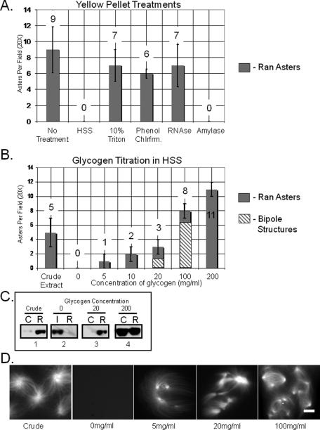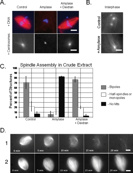 The assembly of microtubules during mitosis requires many identified components, such as γ-tubulin ring complex (γ-TuRC), components of the Ran pathway (e.g., TPX2, HuRP, and Rae1), and XMAP215/chTOG. However, it is far from clear how these factors function together or whether more factors exist. In this study, we used biochemistry to attempt to identify active microtubule nucleation protein complexes from Xenopus meiotic egg extracts. Unexpectedly, we found both microtubule assembly and bipolar spindle assembly required glycogen, which acted both as a crowding agent and as metabolic source glucose. By also reconstituting microtubule assembly in clarified extracts, we showed microtubule assembly does not require ribosomes, mitochondria, or membranes. Our clarified extracts will provide a powerful tool for activity-based biochemical fractionations for microtubule assembly.