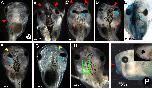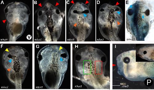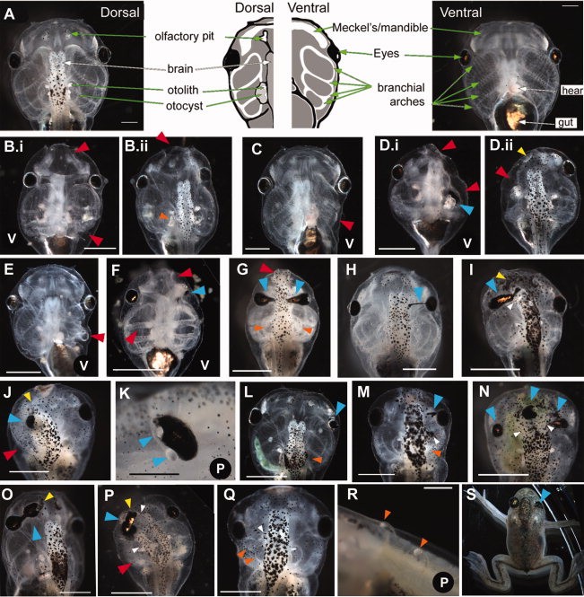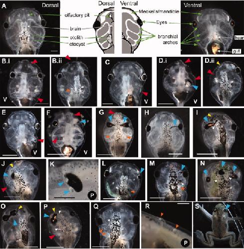 Fig. 3. Range of tadpole craniofacial phenotypes caused by injection of xduct-noTM4 at the 1-, 2-, or 4-cell stage. Tadpoles were scored and imaged between stage 45 and 48. In all images, large red arrowheads indicate abnormalities of jaws and branchial arches, large blue arrowheads indicate eye or pigment abnormalities, small yellow arrowheads indicate olfactory pit abnormalities, small orange arrowheads indicate otocyst and/ or otolith abnormalities, and small white arrowheads indicate abnormal brain tissue. All views are dorsal except where indicated by a V (ventral) or a P (profile). Anterior is up except in K and R in which anterior is left and dorsal is up. All scale bars 1 mm unless otherwise indicated. A: Wildtype morphology, dorsal and ventral aspects; drawing summarizes major structures. Scale bar 500 mm. B: Ventral and dorsal views of a tadpole with badly malformed jaw and left branchial arches (red) as well as a malformed otolith (B.ii, orange). C: Ventral view of a tadpole with small left-sided branchial arches (red). D: Ventral and dorsal views of a tadpole with left-sided abnormalities of the jaw, branchial arches (red), eye (blue), and olfactory pit (yellow). E: Ventral view of malformed left-sided branchial arches (red). F: Ventral view of bilateral abnormalities of the jaws and branchial arches, which lack the normal teeth (red). The left eye of this tadpole is not visible and thus abnormal (blue). G: Bilateral abnormalities of the jaw (red), eyes (blue), and otoliths (orange); the branchial arches are also small. H: Pigmentation of the optic nerve (blue), a commonly seen abnormality. I: Thickening and pigmentation of the connection between the eye and brain (blue) is also commonly observed. This tadpole also has a malformed or missing olfactory pit (yellow) and abnormal growth of the brain (white). J: Unilateral changes to the olfactory pit (yellow), eye (blue), and branchial arches (red). In this tadpole, the eye appears to be directly attached to the brain. K: Eye with two lenses; it is not clear which lens is ectopic (blue). Scale bar 250 mm. L: Embryo with a small eye (blue) and missing otocyst/otolith (orange). M: Tadpole with ectopic pigment near to the eye (blue), extra brain tissue (white), and missing otocyst/otolith (orange). N: Tadpole with malformed eyes and ectopic pigment along the midline (blue), as well as brain shape abnormalities (white). O: Tadpole with an ectopic eye, connected to the original by a pigmented bridge (blue) that is fused with the olfactory pit (yellow). P: Tadpole with left-sided abnormalities including small branchial arches (red), and a second brain (white) apparently fused to a large distorted eye (blue) and olfactory pit (yellow). Q: Tadpole with small outgrowth of brain (white), a misformed otocyst (orange), and a missing otolith on the left side. R: Ectopic otoliths growing along the dorsal midline. Scale bar 500 mm. S: This froglet received xduct-noTM4 at the one-cell stage, developed into a tadpole with a malformed eye, then metamorphosed. The eye abnormality is still visible (blue). |