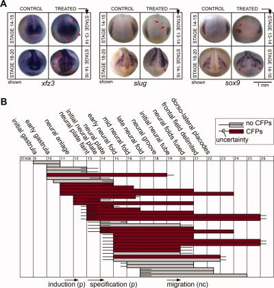 Fig. 5. Inhibition of ductin by concanamycin affects WISH patterns and indicates that ductin is required during late gastrulation and early neural plate stages. A: Treatment of embryos with the highly specific ductin inhibitor concanamycin leads to changes in the WISH patterns of xfz3, slug, and sox9. Like injection of xduct-noTM4, these changes can be seen as early as stage 14 and are still apparent at stage 20. Embryos in the top row of each panel were exposed to concanamycin from stage 13 to stage 14, then fixed at stage 145 for WISH; embryos in the bottom row were exposed from stage 14 to stage 16, then fixed at stage 180 for WISH. Timing was chosen on the basis of the concanamycin exposure experiments shown in B. B: Effect of exposure to the ductin-inhibitor concanamycin at different stages (indicated on the top and bottom); each horizontal bar represents a batch of embryos treated with concanamycin; gray bars indicate that this sample did not have significantly more CFPs than the untreated control, red bars indicate a significant difference of >10% between controls and experimentals (a 0.01). Error bars represent an estimate of the uncertainty of identifying stages. Exposure to concanamycin from stage 13 to 16 caused craniofacial abnormalities. |