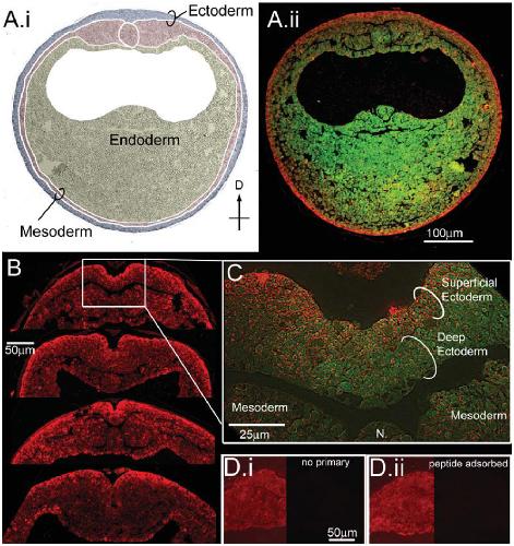 Fig. 6. Ductin is present at high levels in the superficial ectoderm during neural plate stages. A: Immunohistochemistry for ductin on cross-sections from neurulating embryos. A.i: Germ layers are indicated on the DIC image of the section in A.ii. A.ii: Green is autofluorescence of the section, red is ductin signal. Ductin is ubiquitous, but stains most strongly in the superficial ectoderm (SE) at this stage. B: Cross-sections through the dorsal midline showing various configurations of the neural fold. In all sections, ductin signal is strongest in the SE. C: Higher magnification shows ductin concentrated in, although not exclusively localized to, the SE. D.i: Control section exposed to 2 Ab only. The left side of the image has been manipulated in Photoshop to show the position of the section; right side of image shows the actual signal at same exposure as B. D.ii: Control sections exposed to peptide-adsorbed antibody; sides as in D.i. |