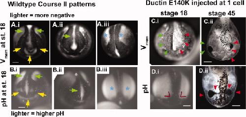 Fig. 7. Inhibition of ductin causes changes in voltage patterns that correlate with CF phenotypes. A: Stills of wildtype embryos showing the pattern of Vmem in the anterior and antero-dorsal regions of neurulae at approximately stage 18. Arrowheads point to the most consistent features of the pattern (11 of 11 uninjected embryos). A.i: Green arrows point to depolarized neural folds. Yellow arrows point to hyperpolarization in the future olfactory/oral region. A.ii: Green arrow points to the disappearing signal from the neural tube floor. A.iii: Blue asterisks mark hyperpolarized ectodermal regions lateral to the neural folds. B: The pattern of pH in the anterior and antero-dorsal regions of untreated neurulae. Arrows point to features of a normal pattern, and are the same as Vmem shown in A. C, D: Abnormal regionalization of Vmem and pH caused by injection of xductnoTM4. C.i: Abnormal Vmem patterns were seen in 9 of 13 injected embryos. Green arrowheads point to the normal depolarized neural folds, red arrows to the abnormal hyperpolarized side. D.i: Red lines indicate the abnormal angle between the high pH lateral ectoderm and the low pH anterior folds. C.ii, D.ii: The same embryos imaged at stage 45 display gross malformations (red arrowheads) in the areas with abnormal Vmem or pH. |