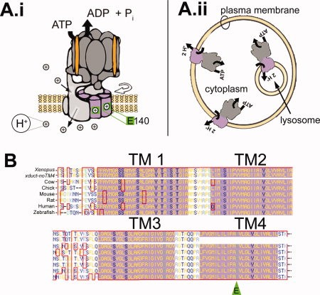 Fig. 1. Ductin basics. A.i: Ductin (purple) is part of the transmembrane proton transporting V0 domain of the HV-ATPase (Entrez Gene Name: ATPase, Htransporting, lysosomal 16 kD, V0 subunit c; drawing after Hinton et al., 2009). The V0 domain includes a hexamer comprising four ductin monomers plus two similar proteins, c0 and c00. Protons () enter subunit a on the cytoplasmic side (top thin black arrow) and are picked up by a glutamic acid (E140, green) in TM4 of ductin. After rotation (curved, open arrow), ductin delivers the proton to another site in subunit a, which releases it to the other side of the membrane (lower thin black arrow). A.ii: The HV-ATPase acidifies the lumen of intracellular vesicles, including lysosomes. In some cells, it is present in the plasma membrane. B: The amino acid sequence of ductin is very highly conserved. The four transmembrane domains are indicated by the purple background; the proton binding E is indicated by the green arrowhead. The top sequence is Xenopus ductin, the next is xduct-noTM4. Below that are the cow, chick, mouse, rat, human, and zebrafish sequences. |