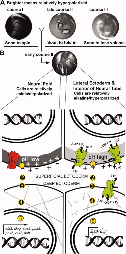 Fig. 8. Summary model of Vmem/pH-dependent signaling. A: The three courses of electrophysiological activity (Fig. 2). At approximately stage 18, a consistent pattern appears: depolarized neural folds (darker), hyperpolarized lateral ectoderm (brighter). B: A typical wildtype stage-18 embryo. The pattern shown here for Vmem compartments matches the pattern seen for pH compartments at the same stage. Drawings illustrate our model. The Vmem and pH of the SE cells, labeled 1 in the drawing, influence gene expression in the nearby deep cells, labeled 5. The electrophysiological state of the SE cell can influence the genes of the deep cell by various mechanisms, (1 ,2 , 3, and 4). Secretion of signaling molecules can be affected by the HV-ATPase-dependent control of vesicle pH (1), consistent with Cruciat (2010). Proteins on the surface of the SE cell (2) can be voltage or pH gated; many only function in a narrow range of pH or Vmem. The pH of the intercellular space (2), would also affect diffusible signaling molecules, or the receptors on the surface of the deep cells (3), by the same mechanism. After reaching the surface of the deep cell, the signal could be carried to the nucleus by any of a myriad of signaling pathways. We also hypothesize that the bioelectric signal originating in the SE cells affects the mechanical state of the cells. One hypothesis is that changes in Vmem open voltage-gated Ca2+ channels (3), leading to Ca2+-dependent changes in the cytoskeleton (4), an important player in cell shape change and invagination. Another possibility is that Vmem changes trigger voltage-gated ion channels (3), causing ion and thus water efflux, changing the osmotic pressure of the cells, and thus their resistance to shape change. This is consistent with our observation that cells expressing abnormally high amounts of xfz3 often appear larger. |