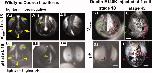 Fig. 2. Regions of relatively hyperpolarized (brighter) and depolarized (darker) Xenopus ectodermal cells are highly dynamic from stage 13 to stage 27. Stages are approximate due to the limitations of judging two dimensional images. Scale bars 250 mm. Orientation of the dorsal-ventral axis is indicated by lines, except in B 13 to 17 where circles indicate that the embryo is rolling towards the viewer; the V indicates the position of the ventral side, while the orange arrowhead indicates the approximate position of the anterior pole. A: Ventrolateral view of course I. A wave of hyperpolarization travels across the embryo in approximately 15 min, then is stationary for several minutes before disappearing. Time (t) is in minutes. B: The first panel shows a ventral view of an embryo at stage 13 in which the circle of hyperpolarized cells of course I is directly visible. Course II of the bioelectric activity begins at approximately stage 14. The visible signal emitted by the interior of the neural tube is particularly intense compared with the rest of the embryo, and changes shape between stages 14 and 19, including an hourglass at 16 to a teardrop at 17 (green arrows). At stage 18, the signal from the neural tube appears to thin. A patch of hyperpolarized cells just anterior to the neural tube signal, at the position of the stomodeum, appears, grows, then remains until approximately stage 23 (yellow arrows, and circles in C). Also at stage 18, hyperpolarized regions appear lateral to the neural folds on the dorsal side; the anterior extents of these regions are visible at the top of these images (orange arrows; see also Fig. 7A). These are visible from stage 18 until stage 21. At stage 19, lateral to the stomodeal region and apposed to the dorsolateral corners of the cement gland, foci of hyperpolarization appear, then spread as thin lines both ventrally, underlining the cement gland, and dorsally reaching the lateral edges of the neural folds by stage 20 (brown arrows), forming a semicircle, approximately in the position of the first pharyngeal pouch. Also at stage 19, a spot of hyperpolarization appears in the right eye/olfactory placode field (blue arrow). At stage 26, the hyperpolarized spot that formed in the eye/olfactory placode area is still present, but by stage 27 that spot is much reduced and in the position of the olfactory placode (light purple arrow). A hyperpolarized spot in the approximate position of the otic placode is also visible at this stage (magenta arrow). C: In course III, foci of hyperpolarity (circled in red) appear, spread, and disappear at different positions on the surface of the embryo, coincident with embryo stretching (compare stage 20 to stage 22). Also shown is that a course III area can spread over a course II area (blue and yellow circled areas) without disturbing it. |