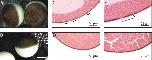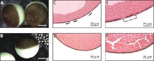 Figure 3. Amikacin/ciprofloxacin supplementation prevents black foci formation. Bright-field micrographs of extracted oocytes incubated for 4 d in tetracycline/gentamicin-supplemented (ND96-GT; A) or amikacin/ciprofloxacin-supplemented media (ND96-ACT; B). Bars, 0.5 mm. Histopathology slices of a compromised oocyte (C) and a healthy oocyte (D), magnified in E and F, respectively. Brackets denote areas of increased pigmentation; arrows indicate areas devoid of pigment molecules, both of which were only observed in infected oocytes.