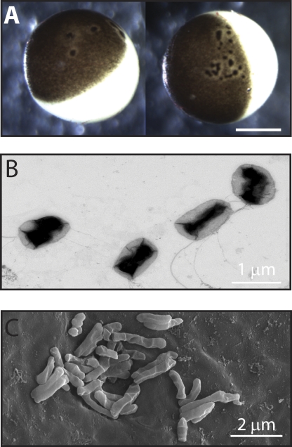 Figure 1. Xenopus laevis oocytes infected with multi-drug–resistant bacteria. (A) Bright field micrograph of extracted oocytes showing the characteristic black foci and unpigmented halo. Bar, 0.5 mm. (B) Transmission electron micrograph of P. fluorescens cultured from compromised oocytes. (C) Scanning electron micrograph of bacteria on the surface of compromised oocytes.
