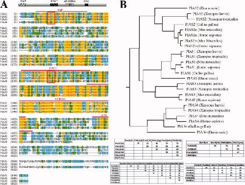Figure 1. PIAS proteins are conserved across the vertebrate species. A: Alignment of the four Xenopus laevis PIAS proteins reveals that they share a high degree of homology within the known functional domains, including the SAP, PINIT, SP-RING, and SIM domains (marked by the red lines above the sequences), but are more divergent in the carboxyl termini. The LXXLL motif in the SAP domain and the PINIT motif in the PINIT domain are marked by the closed boxes. B: Alignment of vertebrate PIAS proteins shows that PIAS are highly conserved in vertebrate. The phylogenic tree constructed using the neighbor-joining algorithm is shown here, and the identity tables for each vertebrate PIAS protein are shown at the bottom.Download figure to PowerPoint