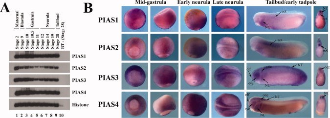 Figure 2. Expression of the PIAS genes during early Xenopus development. A: Temporal expression analyses by RT-PCR showed that all four PIAS genes were maternally expressed, and their expression persisted until at least tailbud stages. B: Spatial distribution of PIAS transcripts assayed by in situ hybridization revealed that the PIAS genes had overlapping and distinct expression patterns. The embryos are shown at mid-gastrula stages in columns 1 (vegetal view) and 2 (lateral view), late gastrula/early neurula stages in column 3 (lateral view), neurula stages in column 4 (dorsal view), and tailbud/early tadpole stages in column 5 (lateral view). The bisected embryos from tailbud stage embryos are shown in column 6. The labeled structures are: NT, neural tube; not, notochord; NC, neural crest; otic, otic placode; olf, olfactory placode; and eye, eyeprimordium.Download figure to PowerPoint