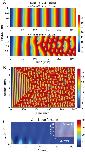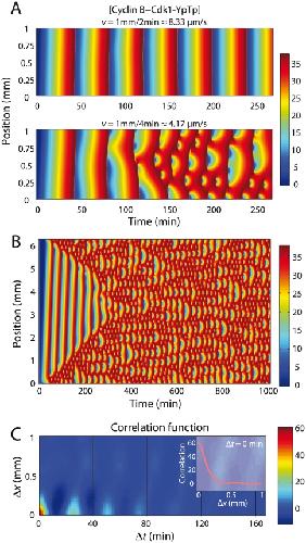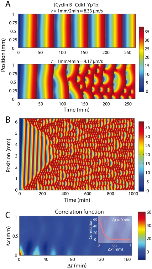 Figure 3. Cell-cycle equations exhibit chaotic behavior with extreme sensitivity to initial conditions.(A) Simulations with two different calcium wave speeds in 1 mm embryos, with colormap showing the concentration of doubly phosphorylated Cyclin B - Cdk1 complex. Simulation cell is 1D with no flux boundary conditions. (B) Simulation in a large (6 mm) 1D embryo with periodic boundary conditions. (C) The space-time correlation function is computed using the mean-centered values in (B) between min. and min. (inset) The correlation length is computed to be mm at .