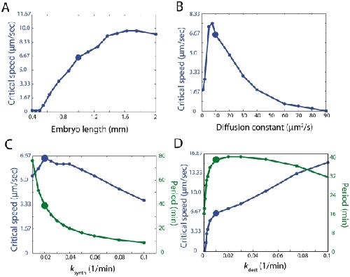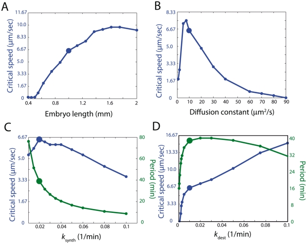 Figure 4. Sensitivity analysis of cell-cycle equations.(A–D) The critical calcium wave speed, , and the period, , are computed for different values of the (A) embryo length, (B) protein diffusion constant, (C) rate of cyclin synthesis , and (D) rate of APC activity .