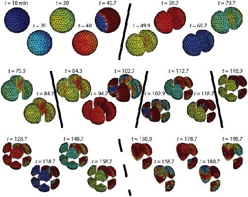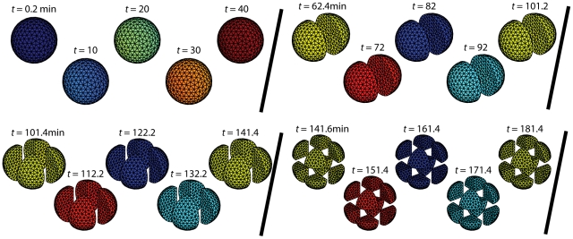 Figure 5. Cell-cycle simulations with cellularization.The embryo is a 1 mm diameter sphere and the calcium wave speed is 1 mm/4 min4.17 m/s. Mitotic divisions are taken when Cyclin B-Cdk1-YpTp reaches half its concentration for uniform oscillations, and are modeled by a no-flux boundary dividing a cell into two equal volumes. By this metric, the first division occurs after 62 minutes, and each subsequent division occurs at 39.2-minute intervals. Solid diagonal lines indicate cellular divisions.