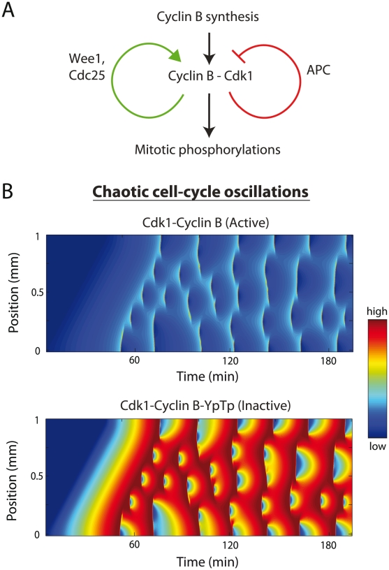 Figure 1. Diffusive spread of cell-cycle activity.(A) The cell-cycle is driven by a combination of positive and negative feedback loops, which modulate Cdk1 activity through phosphorylation/dephosphorylation. (B) 3.33-hour simulation where cell-cycle activity spreads across a mm embryo. In the spreading model, oscillations initially occur in only of the embryo (i.e., APC is initially assumed to be active only between and mm in a 1 mm long embryo). Through diffusion, oscillations are able to spread across the embryo via local activation of APC once a local critical threshold of overall Cdk1 activity is reached. Each species is initially at its pre-fertilization concentration, with the activity threshold chosen to be when Cyclin B-Cdk1-Tp reaches 4× its initial value. The species plotted in the top panel is Cyclin B-Cdk1 (active) and that plotted in the bottom panel is Cyclin B-Cdk1-YpTp (inactive). In the inactive complex, Cdk1 is phosphorylated at both Threonine-14 and Tyrosine-15.