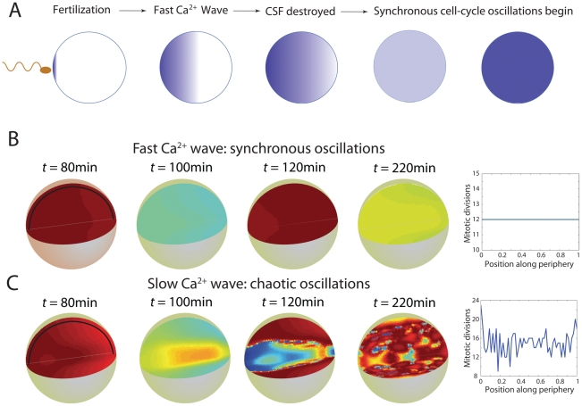Figure 2. Modeling the cell-cycle in developing embryos.(A) Schematic of early development. Across species, fertilization results in a fast calcium wave that sweeps across the embryo. In X . laevis, the result is the destruction of CSF, the consequent restoration of APC-mediated negative feedback, and the subsequent initiation of synchronous nuclear divisions. (B,C) Cell-cycle simulations for spherical embryos with diameters of 1 mm. The fast and slow calcium waves have speeds of 0.36 and 0.125 mm/min, respectively. The number of mitotic divisions that occur in 8 hours along the black lines in the first panel are shown at right.