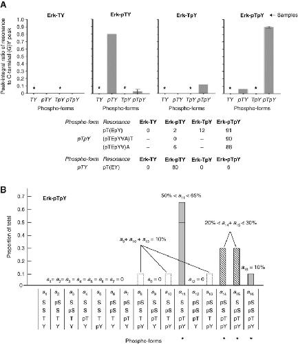 Figure 6. NMR analysis and four-site phospho-form distribution. (A) Phospho-form distributions of each of the four Erk samples obtained by NMR. The pTpY phospho-form was determined from three resonances, as tabulated below with their normalised peak integral values. The additional A and T resonances could not be fully confirmed in the Erk-TY and Erk-TpY samples without 3D spectra and were therefore not measured, as indicated by a dash. The pTY phospho-form was determined by the single resonance pT(EY), as also tabulated. The TY and TpY phospho-forms were not detectable, indicated by the asterisks in the distributions. The bars show either a single data point or the mean±s.d. Measurements agree to within 10% with those found by pepMS (Figure 2B). (B) The four-site phospho-form distribution of Erk-pTpY. The 16 phospho-forms are listed horizontally, in the form (p)S(p)S(p)T(p)Y, with their corresponding proportions denoted by a1,L,a16. These values were calculated by combining information from pepMS and proMS for both Erk-pTpY and Erk-pTY, as explained in Supplementary Method 1.2. Grey columns indicate phospho-forms whose individual proportions can be determined or placed between upper and lower bounds. The dashed columns and the columns with a dotted outline indicate two sets of phospho-forms whose individual values could not be determined, but whose sums were limited as shown in the equations. The asterisks mark the phospho-forms on which most of the distribution is concentrated, whose relevance is discussed in the text.