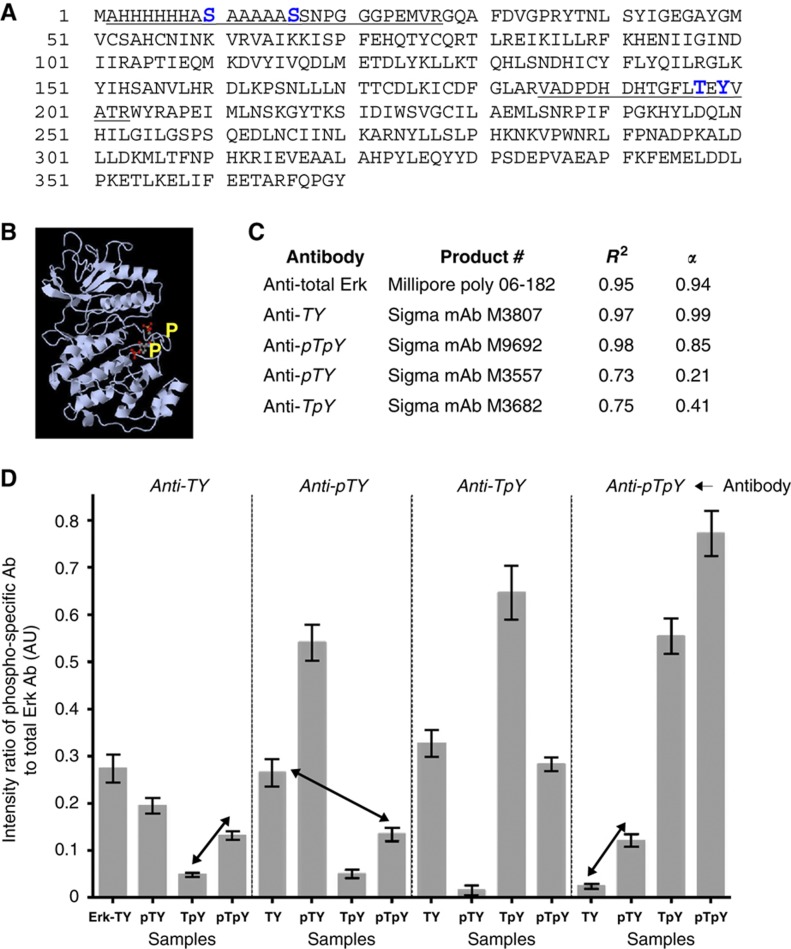 Figure 1. Antibody analysis of Erk. (A) Primary sequence of the His6-tagged Erk2 from Xenopus laevis used in the paper, showing two tryptic peptides identified as being phosphorylated (underlined): the central peptide contains the two activating phosphorylation sites in the canonical TEY motif and the N-terminal peptide (omitting the N-terminal M, which is cleaved) contains the His6 tag and the two novel S-phosphorylation sites discussed in the text. The phospho-sites are marked in large, bold, blue font. (B) Ribbon diagram of Erk2 from Rattus norvegicus (PDB-2ERK) showing activating phosphorylations on T and Y (yellow). (C) Summary of amount/intensity relationship for each antibody. The measures R2 and α are explained in the text and derived from the data in Supplementary Figure 1. (D) Phospho-form measurements. Each vertical sub-panel shows the results from the antibody listed at the top of the sub-panel. Erk samples are listed horizontally at the bottom with X denoting sample Erk-X. Each bar gives the ratio of the fluorescence intensity of the corresponding antibody to the intensity of the anti-total Erk antibody. Both antibodies were multiplexed on the same gel. Each of the four Erk samples were run in triplicate on the same gel and each gel was repeated three times; error bars give the mean±s.d. of the nine data points. The underlying data are shown in Supplementary Figure 2. Note that there is no sum normalisation and it is coincidental that values lie between 0 and 1. The arrows show particular comparisons discussed in the text. Source data is available for this figure at www.nature.com/msb.Source data for Figure 1D.