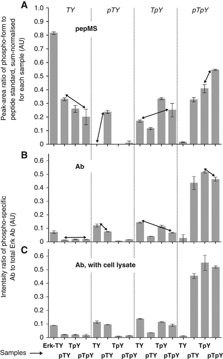 Figure 3. Comparison of pepMS and antibodies. (A) Rearrangement of the phospho-form distributions (Supplementary Figure 3) of the second, non-isotopically labelled sample set. For each phospho-form listed at the top of each sub-panel, the normalised values of the phospho-form for each sample are collected together. Samples are listed at the bottom of the figure. (B) Antibody data for the second sample set, as in Figure 1D. (C) Antibody data for the second sample set, after spiking with whole-cell lysate. The vertical scales for B and C lie between 0 and 1 only by coincidence; there is no sum-normalisation, as there is for A. The arrows show comparisons discussed in the text. Similar results were obtained using HRP-conjugated antibodies and CCD imaging (Supplementary Figure 4). Source data is available for this figure at www.nature.com/msb.Source data for Figure 3B. Source data for Figure 3C.