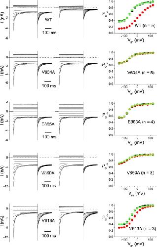 Figure 2. Effects of alanine mutations for four residues on the ATP modulation of CLC-1. (left and middle) Recording traces of WT CLC-1 and the four mutants. The recordings in the absence (left) and in the presence (middle) of 3 mM ATP were obtained from the same patch (pHi 6.8). (right) Steady-state Poc-V curves of WT CLC-1 and the four alanine mutants shown in left and middle panels. Black squares, red circles, and green triangles represent the data in control (before ATP), 3 mM ATP, and washout, respectively.