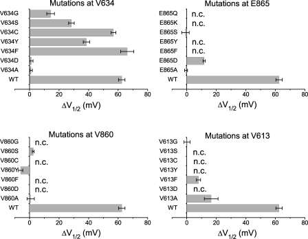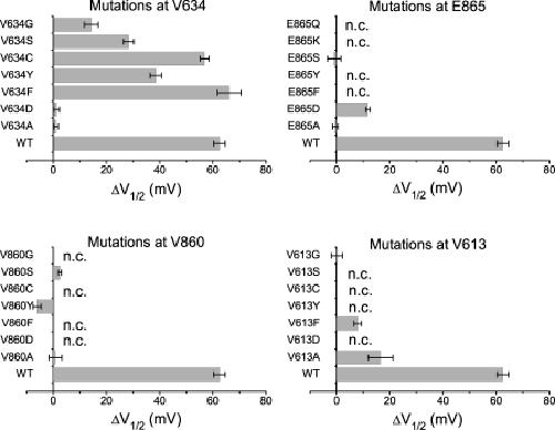 Figure 3. Changes of the V1/2 of the Poc-V curves of various mutants in response to 3 mM ATP at pHi 6.8. The Poc-V curves of each mutant in the absence and in the presence of 3 mM ATP were constructed from the same patch, and the V1/2 of the Poc-V curves were obtained by fitting the data points to a Boltzmann equation. The difference in V1/2 between control and 3 mM ATP (ΔV1/2) was first determined from each patch and then averaged (n = 14 for WT CLC-1 and n = 4–7 for various mutants). The label n.c. indicates that the mutant did not show functional current in at least two runs of expression in Xenopus oocytes. Error bars represent SEM.