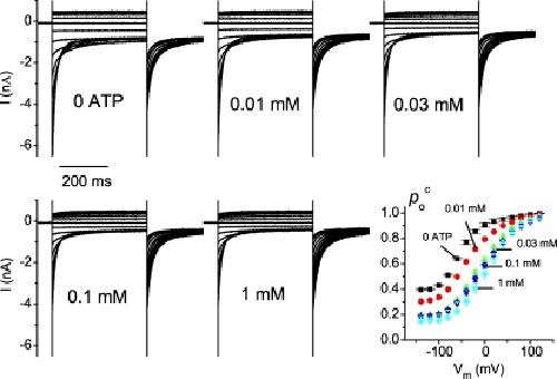 Figure 4. The V634F mutation increases the apparent affinity for the ATP modulation. Representative recording traces were obtained from an excised patch of the oocyte expressing the V634F mutant in control (0 ATP) and in various concentrations of ATP as indicated. The averaged Poc-V curves of the V634F mutant in various ATP concentrations are shown in the bottom right panel. Error bars represent SEM. n = 7.