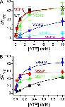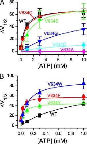Figure 5. Shift of the V1/2 of the Poc-V curve (ΔV1/2) in various mutants of V634 as a function of the ATP concentration. Data points were fitted to Eq. 1 to determine the apparent K1/2 and V1/2,max. (A) Mutants of V634 in which the apparent ATP affinity is reduced. For comparison, the ATP dose–response curve of WT CLC-1 is also shown. (B) ATP dose-dependent curves of WT CLC-1, V634F, V634Y, and V634W. Error bars represent SEM. n = 4–8.