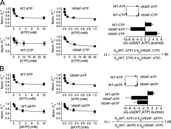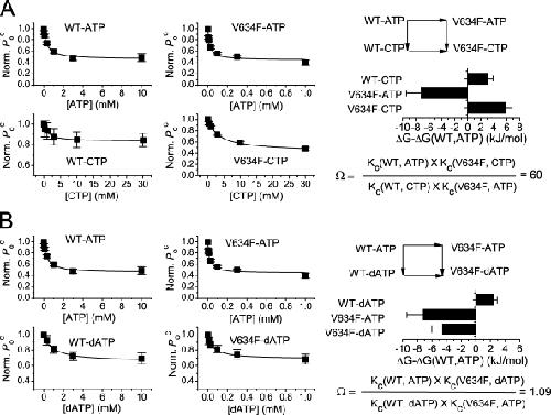 Figure 6. Interaction of nucleotides with residue V634 in the ATP-binding site explored by double mutant cycle analyses. (A) Mutant cycle analysis of the interaction of the nucleotide with residue V634. The ATP and CTP dose–response curves of WT CLC-1 and the V634F mutant were first constructed using the parameter Poc(ATP)/Poc(control) as the dependent parameter. The values of Ko and Kc (Table III) of ATP/CTP modulations were determined by fitting the data points to Eq. 2, and the Kc values were used to calculate the free energy differences of single or double manipulations (bar graph) according to Eq. 3 and the coupling constant, Ω, according to Eq. 4. n = 6–8. (B) Mutant cycle analysis of the nucleotide interaction with V634 using ATP and dATP. The ligand dose–response curves of WT CLC-1 and V634F were constructed using Poc(ATP)/Poc(control) as the dependent parameter. Ko and Kc were determined (Table III), and the Ω value and the free energy differences were calculated accordingly. n = 4–8.
