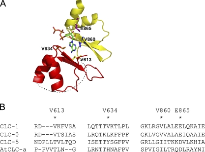 Figure 1. Homology modeling of the C-terminal domain of CLC-1. (A) Homology model of the CBS domain of CLC-1 shown in ribbon presentation. The two segments of CLC-1 sequence corresponding to CLC-5 are colored in red and yellow, whereas the segment that is missing in CLC-5 is illustrated with a dotted black line. ATP is shown in stick presentation (in CPK color). Key amino acids examined in this study are colored in yellow (V613), orange (V634), blue (V860), and purple (E865). (B) Sequence alignment of CLC-0, CLC-1, CLC-5, and AtCLC-a for the region encompassing the four residues shown in A.