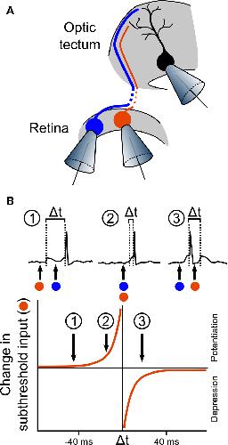 Figure 2. First in vivo observation of STDP in the optic tectum. (A) The first in vivo demonstration of STDP was performed by Zhang et al. (1998) in an elegant experiment, illustrated here. Activity from a single tectal neuron was recorded using whole-cell perforated patch, while two different RGCs that form synaptic connections onto the tectal neuron were loose-patched, allowing stimulation for induction of LTP or LTD. In some of the recordings, one RGC produced suprathreshold responses (illustrated by the blue cell), whilst the other produced only subthreshold responses (illustrated by the orange cell). (B) Analysis of the effects of the timing of the inputs showed that the effect of stimulation on the subthreshold input depended on the timing of its excitatory postsynaptic potentials (EPSPs) relative to the tectal spike that was triggered by the suprathreshold input. If the subthreshold EPSP preceded the tectal spike by more than 20 ms, the input was relatively unaffected (inset 1). However, if the subthreshold EPSP occurred within the 20 ms before the suprathreshold EPSP, and therefore just before the tectal spike, the input was strongly potentiated (inset 2). In stark contrast, if the subthreshold EPSP occurred during the 20 ms immediately following the tectal cell spike, this input was depressed (inset 3). Examination of the effects of a range of timing differences led to an estimated curve for the STDP rule in retinotectal synapses. - See more at: http://journal.frontiersin.org/Journal/10.3389/fnsyn.2010.00007/full#sthash.iocnGBhs.dpuf |