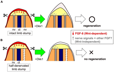 Figure 8. Model for Wnt/β-catenin and nerve signals in early limb regeneration in Xenopus froglets.(A) Successful blastema formation in the intact forelimb of the hsDkk1 froglet. Wnt/β-catenin signaling (presumably mediated by wnt-3a in the epidermis) induces fgf-8 expression in the epidermis. Induction of Dkk1GFP expression by heatshock diminishes epidermal fgf-8 expression. However, nerve signals released from the nerves around the limb stump have some redundant function with FGF-8 and/or the product(s) of another Wnt downstream gene(s), whereas Dkk1GFP does not markedly affect the function of the nerve signals. The nerve signals can substitute for the role of the Wnt downstream gene, so that the limb stump can continue the blastema formation process and form a spike, even after blockage of Wnt/β-catenin signaling. (B) Interrupted blastema formation in the half-denervated forelimb of an hsDkk1 froglet. When the limb stump is partially denervated, the amount of nerve signals is thought to be around half of that in an intact limb stump. This level of nerve signals is insufficient to substitute for the role of the Wnt downstream gene. Thus, most of the limb stumps cannot continue the blastema formation process, resulting in no regeneration, after blockage of Wnt/β-catenin signaling. Considering the redundant function of the nerve signals and a Wnt downstream gene, the nerve signals may be mediated by another member of the FGFs. Scissors indicate the amputation plane. nv, nerves; ct, cartilage.