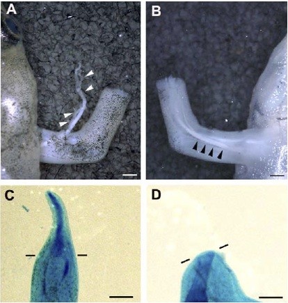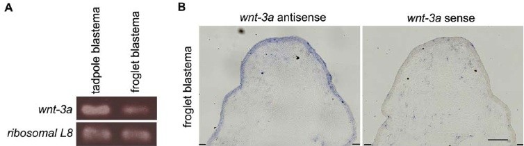 Figure 1. Wnt-3a is expressed in the blastema of both froglets and tadpoles. (A) RT-PCR of the total RNA from tadpole blastemas at 5 dpa or froglet blastemas at 9 dpa showed that wnt-3a was expressed in both the tadpole and froglet blastemas. (B) In situ hybridization of froglet blastemas