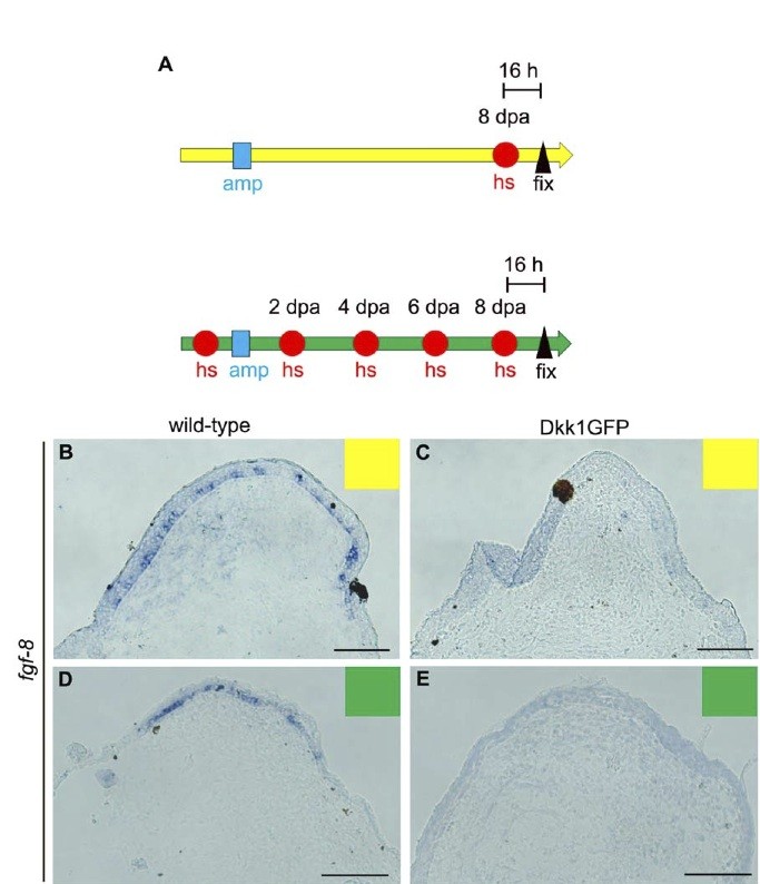 Figure 5. Wnt/b-catenin signaling is blocked in hsDkk1 froglets. (A) Experimental scheme for in situ hybridization. Upper: Froglet forelimbs were amputated (amp: blue square) and heat-shocked (hs: red circle) at 8 dpa, and their blastemas were excised and fixed (fix: black triangle) 16 h after the heatshock for in situ hybridization. Lower: Froglet forelimbs were amputated (amp: blue square) repeatedly heat-shocked (hs: red circles) every other day until 8 dpa, and their blastemas were excised and fixed (fix: black triangle) 16 h after the last heatshock for in situ hybridization. (B and C) In situ hybridization on sectioned samples of froglet blastemas that had been heat-shocked as shown in the upper scheme in (A). The sectioned samples were hybridized with the fgf-8 antisense probe. (D and E) In situ hybridization of sectioned samples of froglet blastemas that were repeatedly heat-shocked as shown in the lower scheme in (A). Sectioned samples were hybridized with the fgf-8 antisense probe. To guarantee correct comparisons of gene expression levels, wild-type (B or D) and hsDkk1GFP froglet (C or E) sections were treated in exactly the same way. Scale bar = 100 mm.