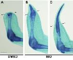 Figure 7. GSK3 inhibitor BIO can rescue spike regeneration of a denervated limb. (A) A DMSO-treated (100 ml/l) control froglet showed no regeneration. (B and C) BIO-treated (1 mM) froglets regenerated a short spike (B) or a long spike (C). Lines indicate the estimated amputation planes. Scale bar = 500 mm. doi:10.1371/journal.pone.0021721.g007